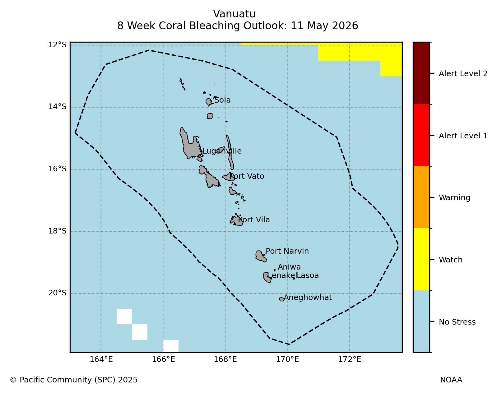 The 8 weeks coral bleaching outlook shows that Vanuatu waters are light blue, which indicates a status of "No Stress". This means that, based on current forecasts, sea surface temperatures are not expected to reach levels that would harm the coral in these areas.