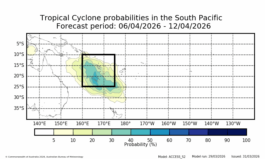 The possibilities for Tropical cyclone developing within the Vanuatu Area of Responsibility has increase to 10-50% for the week of 6th to 12th April.